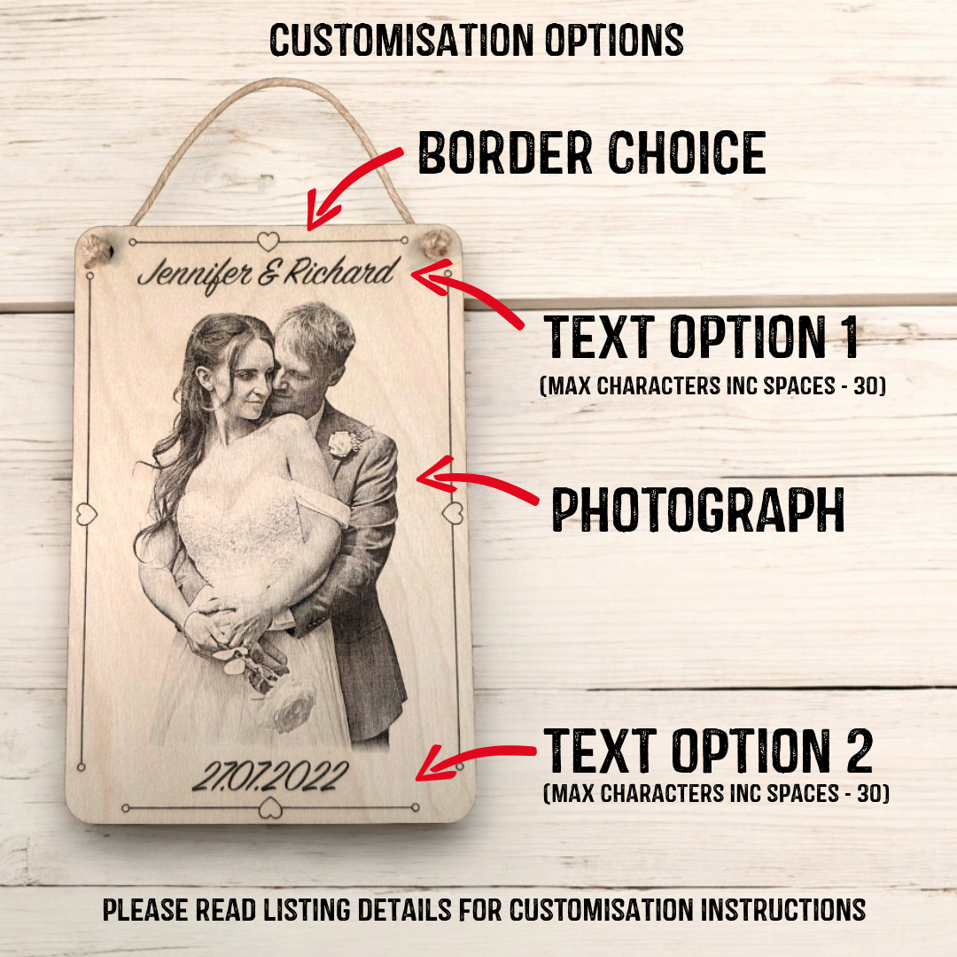 These unique plaques feature a detailed photograph, along with personalised text such as names, dates, or a short message. A decorative border enhances the design, making it a stunning addition to any home. Display your personalized plaque proudly and relive your special memories every day!