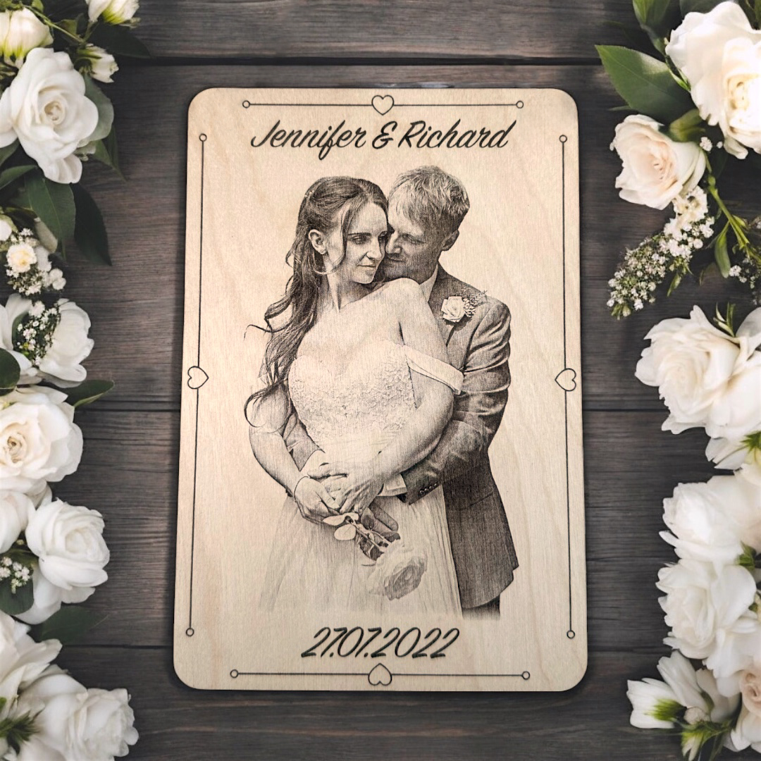 Capture your most cherished memories with our custom wood plaques, beautifully engraved with your favourite wedding or couples photograph and personalised details. Each piece is carefully crafted with laser precision, turning your special moments into timeless works of art. Perfect for weddings, anniversaries, Valentine’s Day, Christmas, or any occasion that calls for a meaningful, heartfelt gift.
